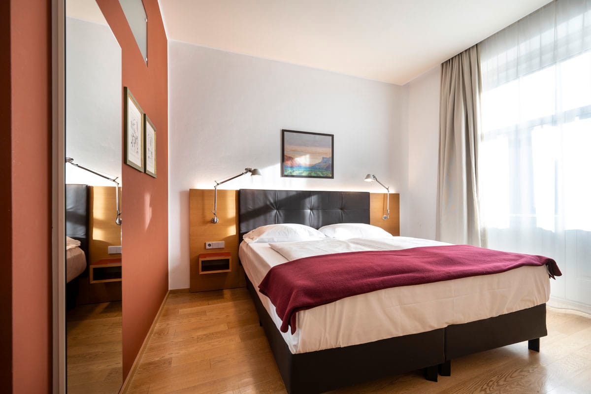 Scelta ideale per chi viaggia a Bolzano in coppia per svago o per vacanza. Questa camera matrimoniale, recentemente ristrutturata, ha un arredamento che si distingue per il suo stile moderno e lineare, realizzato con legno di quercia. Il letto è un largo king oversize boxspring che garantisce un perfetto riposo agli ospiti di questa stanza durante la loro vacanza a Bolzano. Gli ospiti della camera Comfort possono usufruire dei vantaggi della “Bolzano Card“.