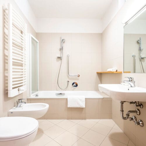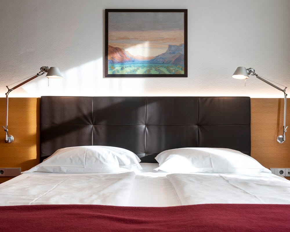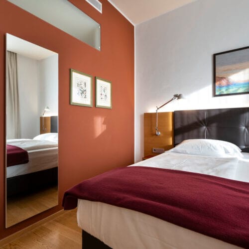 Scelta ideale per chi viaggia a Bolzano in coppia per svago o per vacanza. Questa camera matrimoniale, recentemente ristrutturata, ha un arredamento che si distingue per il suo stile moderno e lineare, realizzato con legno di quercia. Il letto è un largo king oversize boxspring che garantisce un perfetto riposo agli ospiti di questa stanza durante la loro vacanza a Bolzano. Gli ospiti della camera Comfort possono usufruire dei vantaggi della “Bolzano Card“.